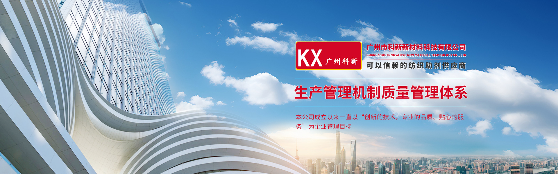 本公司成立以来一直以“创新的技术,专业的品质、贴心的服务”为企业管理目标,建设高效运作的生产管理机制,严格要求的质量管理体系;技术创新能力的企业文化;信诚守法的销售服务网络,健康安全的员工价值体系,致力于让科新公司成为每一位客户认可的、 ”可以信赖的纺织助剂供应商”。